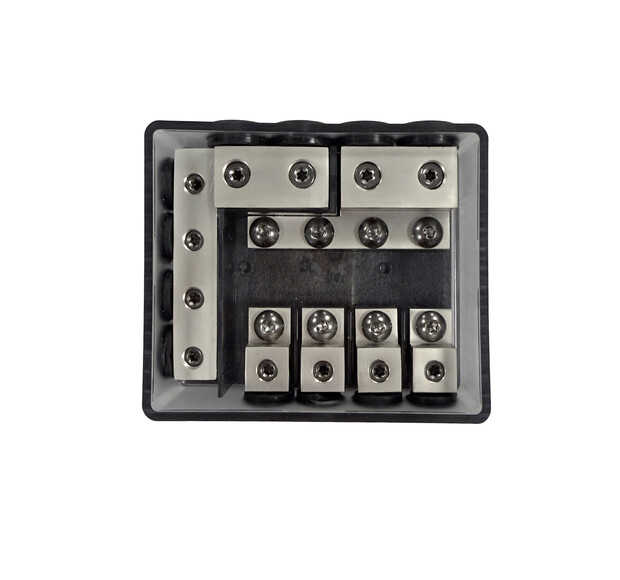 Two 50 mm² inputs to the fuse box pass thru fuses and are distributed, if necessary, into four 20 mm² outputs (these connectors are intended for + currents).